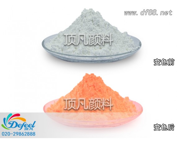 頂凡感光變色粉又稱光變粉、光變顏料、光變色粉等GB005光變橙光變粉其變色原理為吸收特定波長的紫外線光源,藉由該光源之能量而產生顏色變化變為橙色,當特定波長的紫外光源不在時,即恢復原來的白顏色。